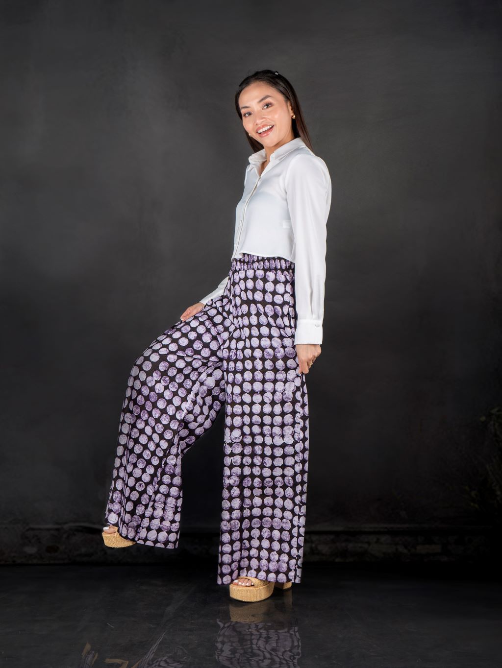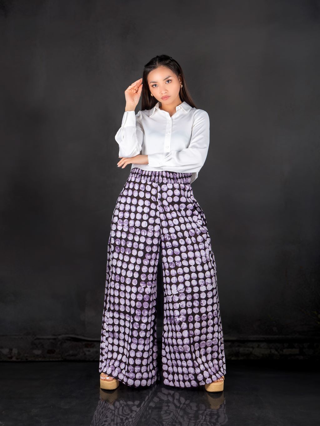 "High-waist, straight-cut palazzo pants with pockets, made from 100% cotton; each pair is uniquely colored to define your silhouette with comfort."