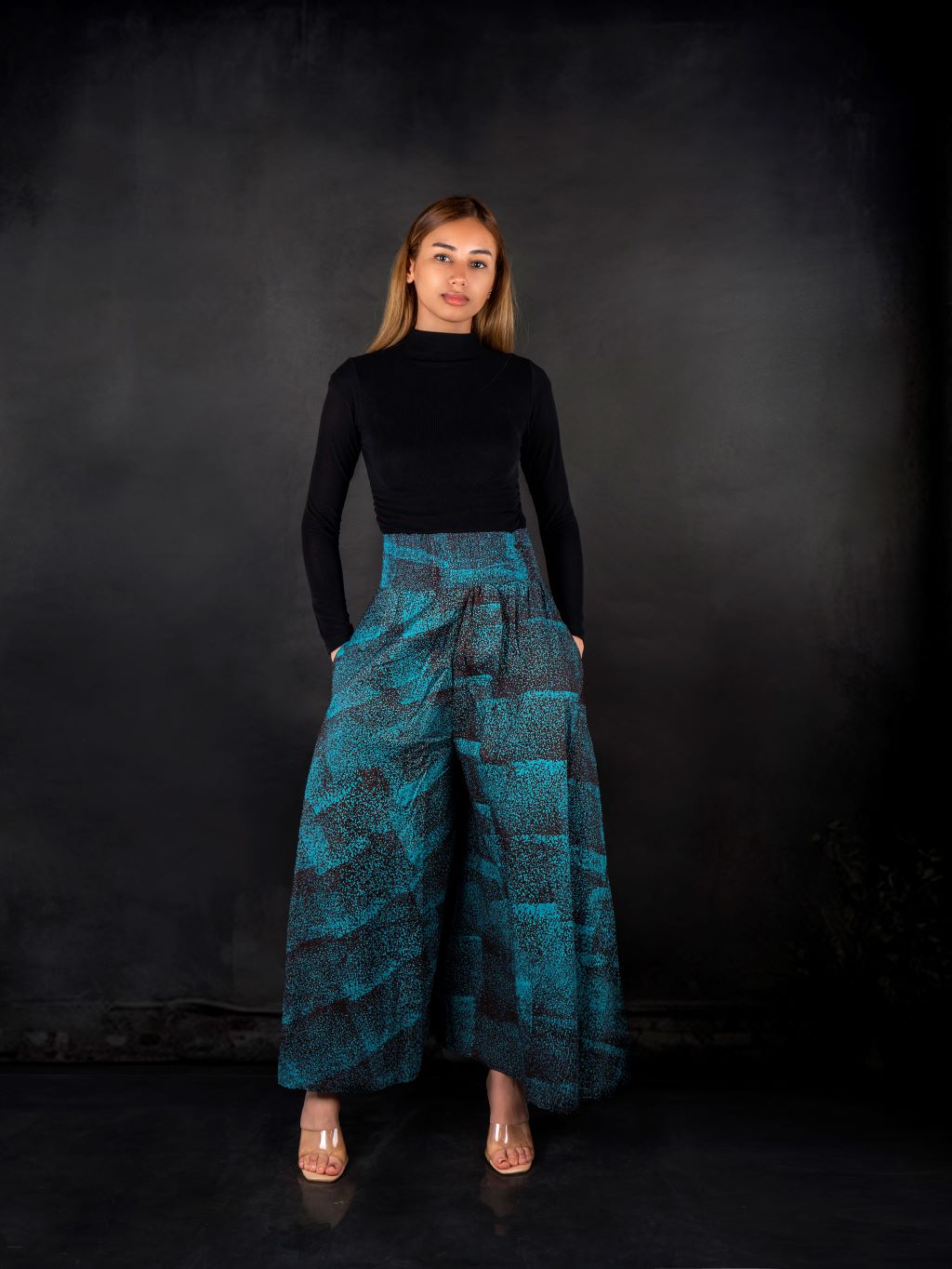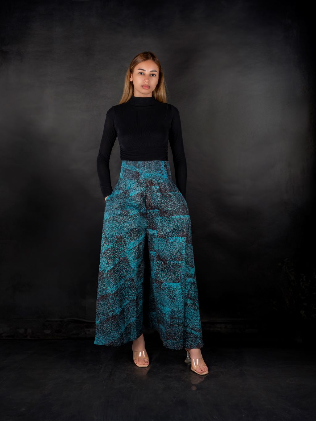 "High-waist, flowy A-line palazzo pants with pockets, crafted from 100% cotton in vibrant, unique tie-dye patterns." -