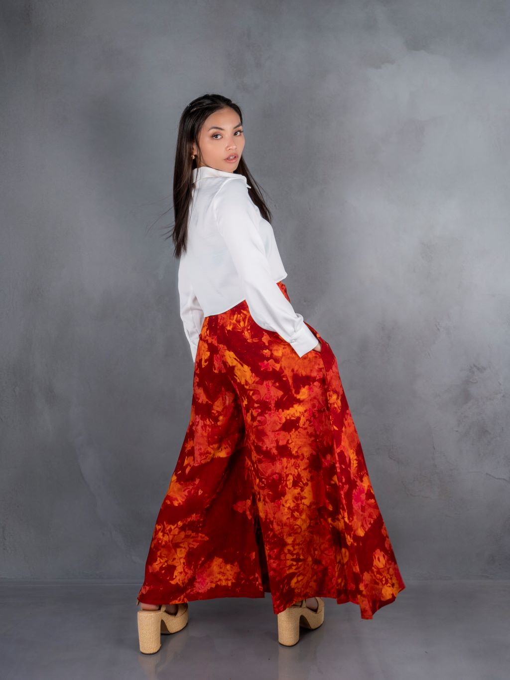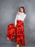 "High-waist, flowy A-line palazzo pants with pockets, crafted from 100% cotton in vibrant, unique tie-dye patterns."