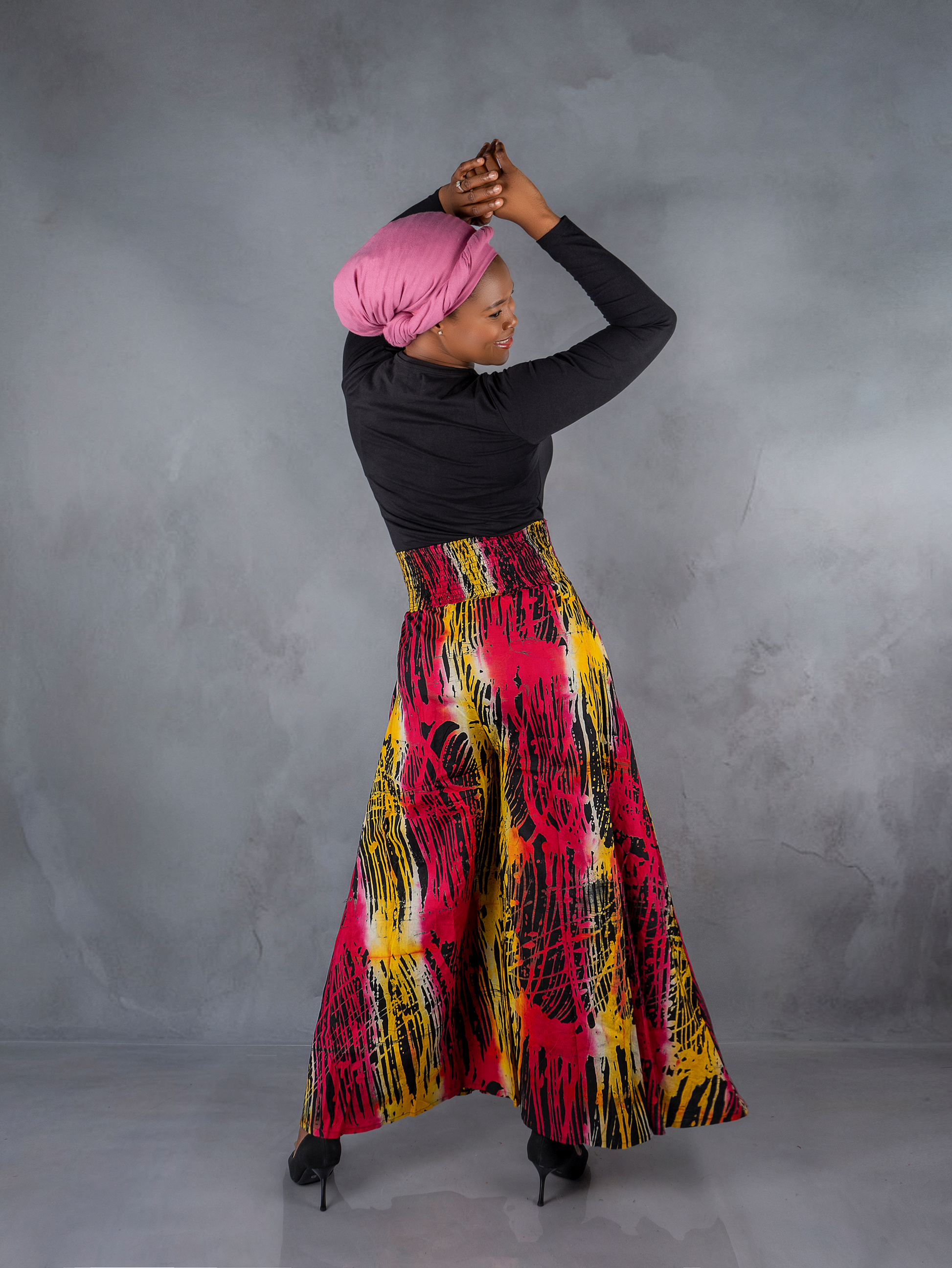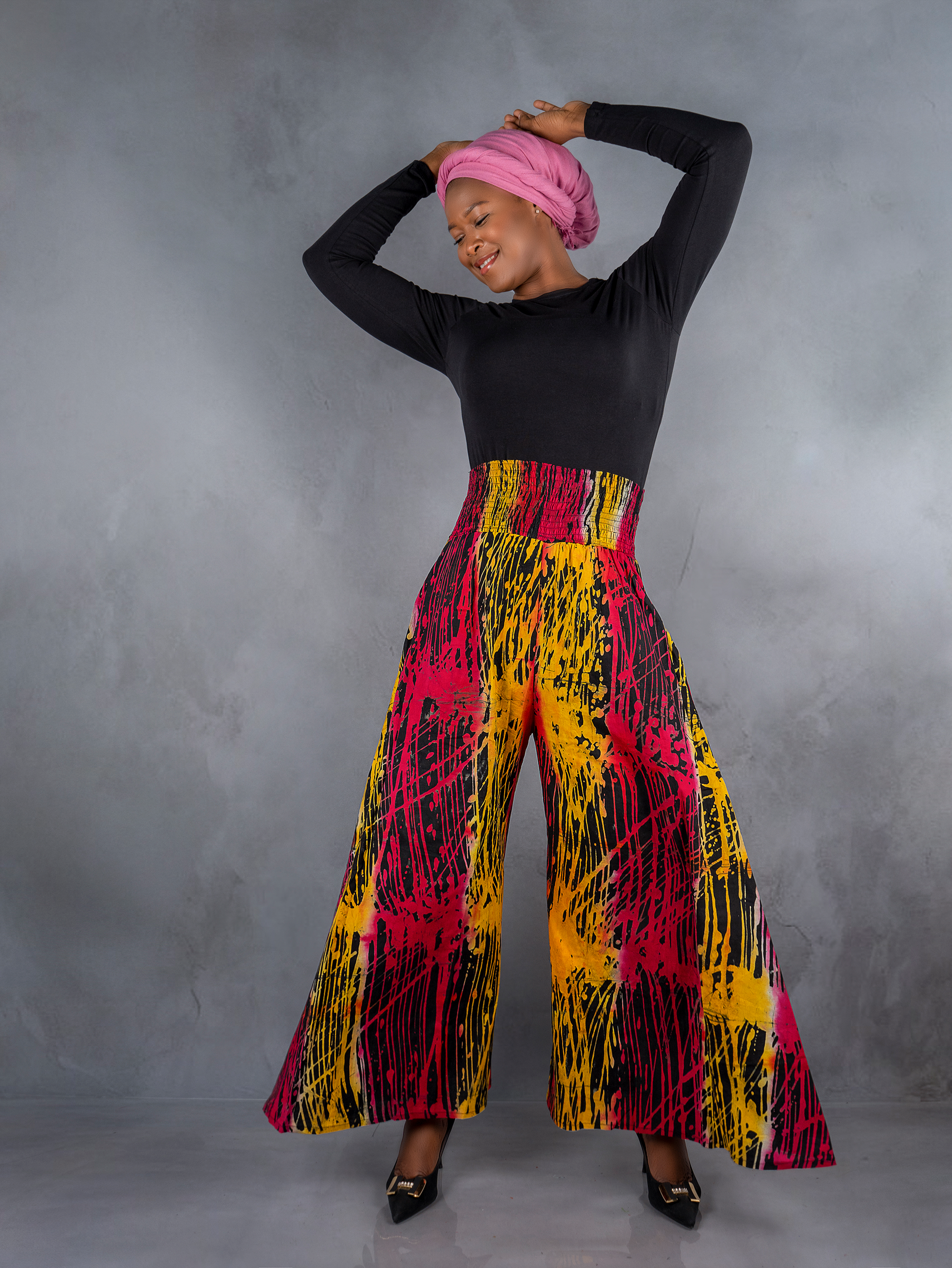 "High-waist, flowy A-line palazzo pants with pockets, crafted from 100% cotton in vibrant, unique tie-dye patterns." -
