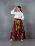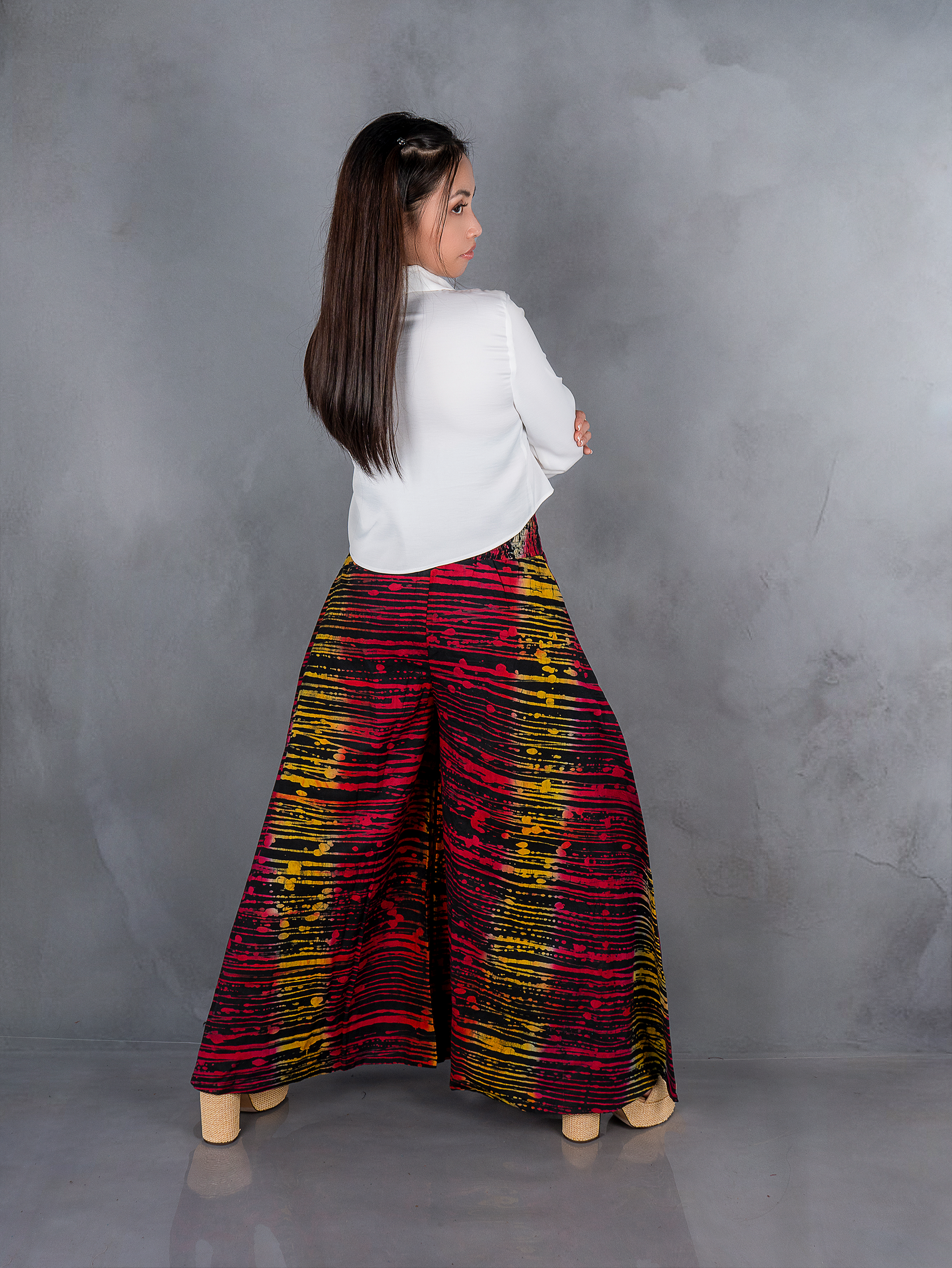 "High-waist, flowy A-line palazzo pants with pockets, crafted from 100% cotton in vibrant, unique tie-dye patterns."