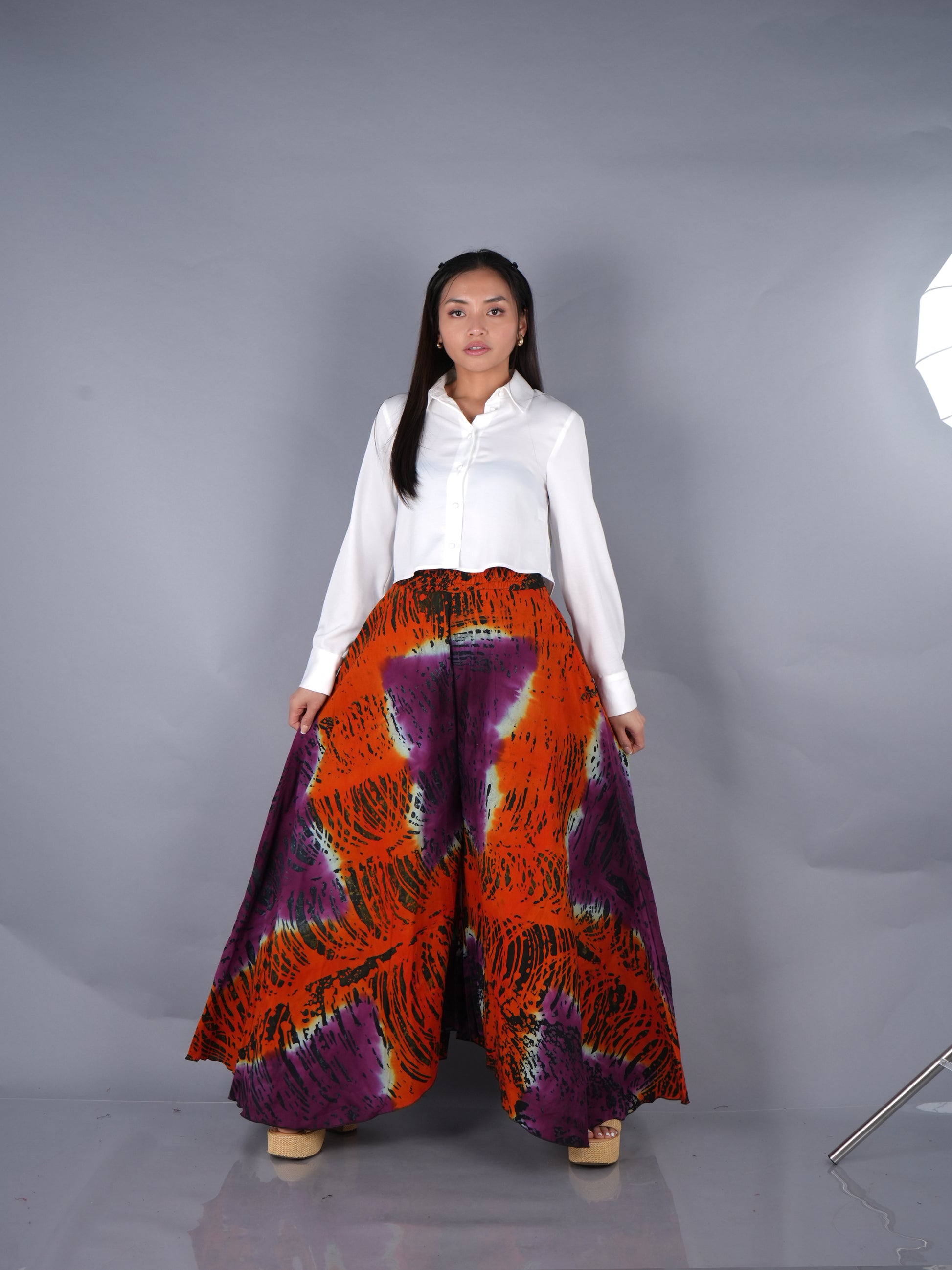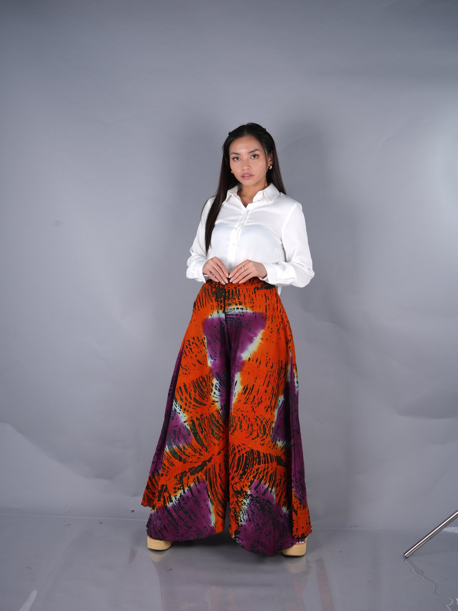 "High-waist, flowy A-line palazzo pants with pockets, crafted from 100% cotton in vibrant, unique tie-dye patterns." -